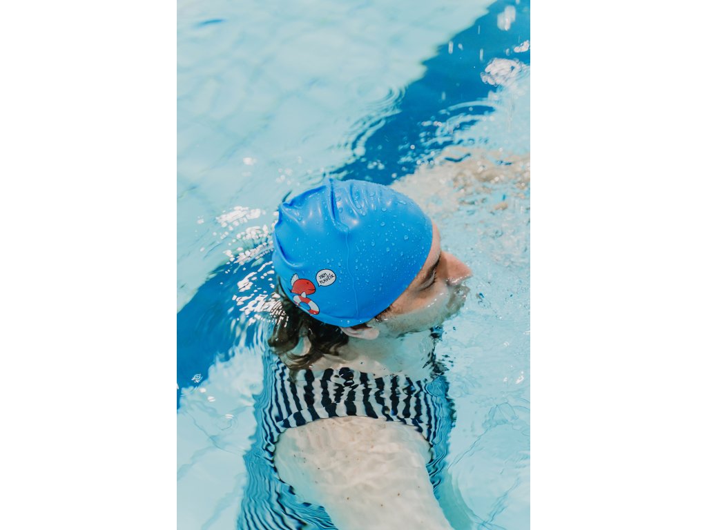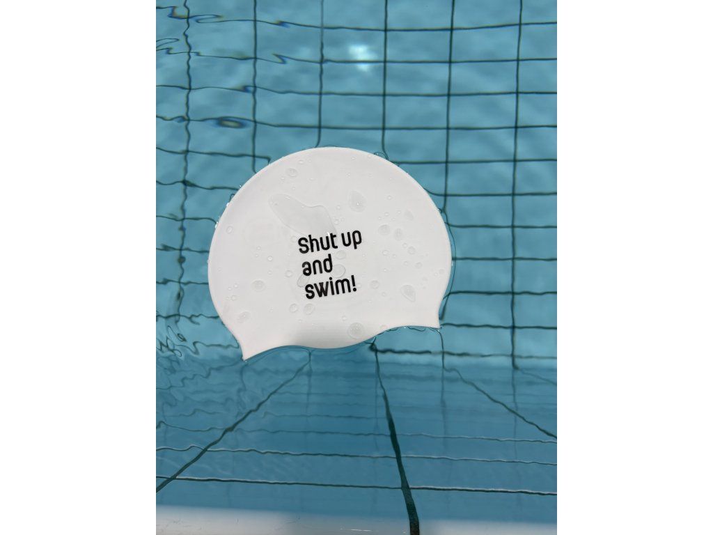 Silikonová plavecká čepice: z jedné strany grafika, z druhé strany logo Shut up and swim!