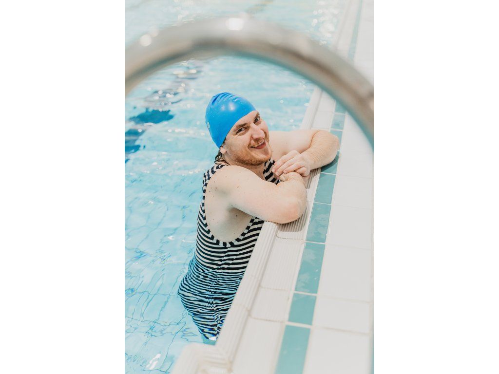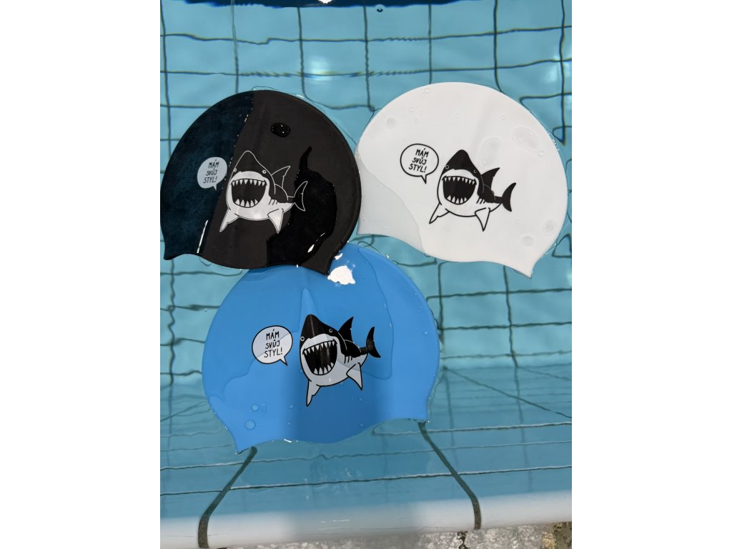 Silikonová plavecká čepice: z jedné strany grafika, z druhé strany logo Shut up and swim!