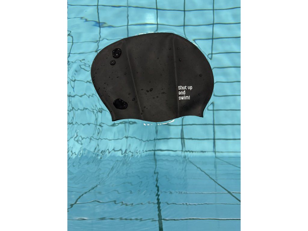 Silikonová plavecká čepice pro dlouhé vlasy s rozšířeným prostorem: z obou stran logo Shut up and swim!