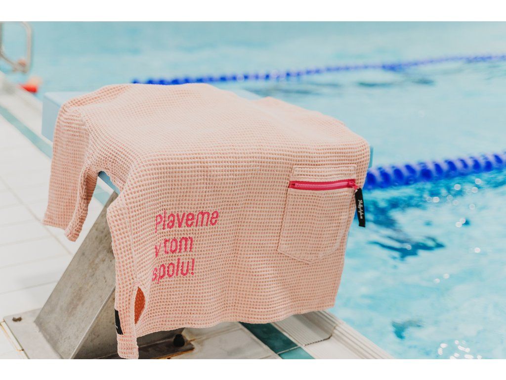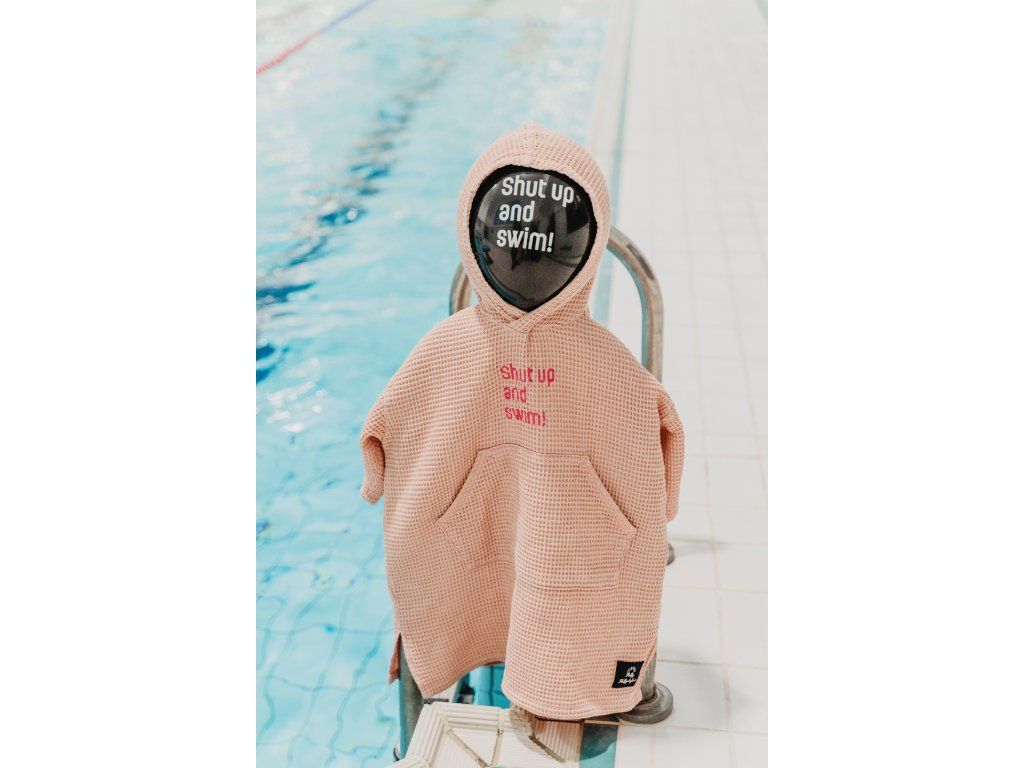 Dětské vaflové růžové bavlněné pončo s bílou výšivkou Shut up and swim, ušito v České republice (zlaté české ručičky 🙌)