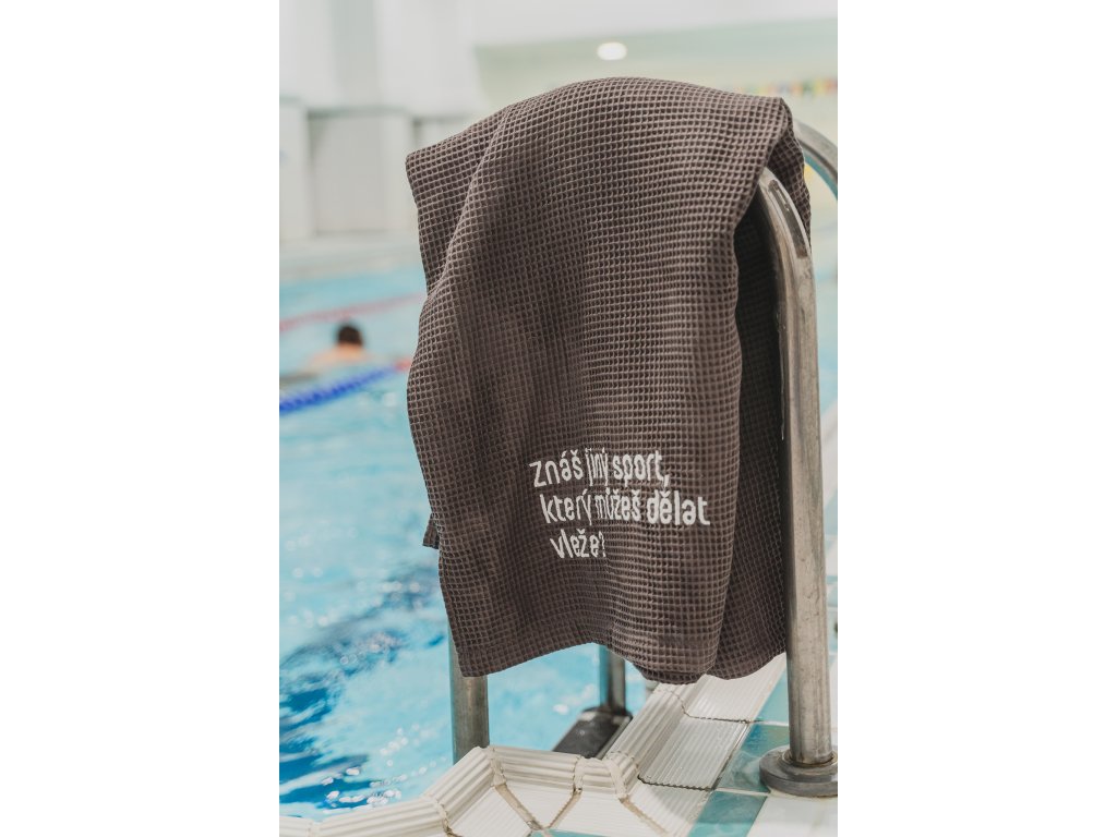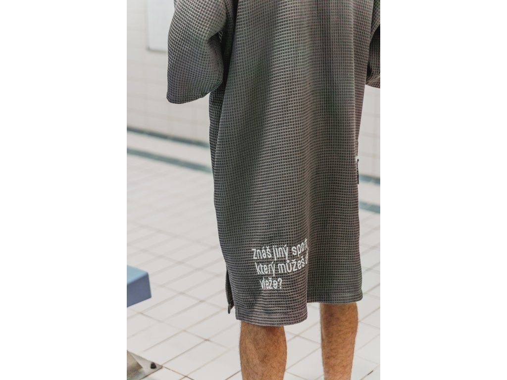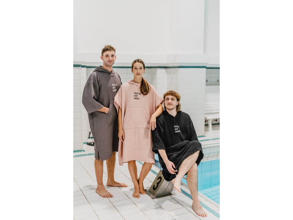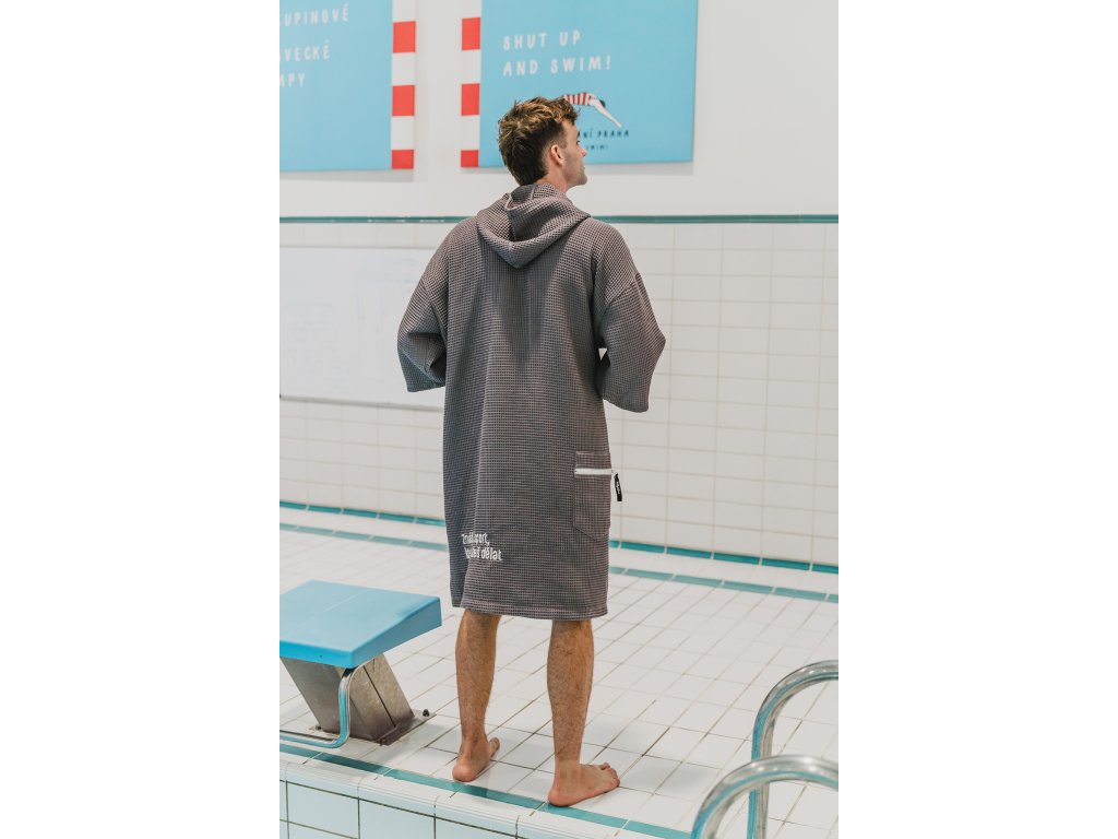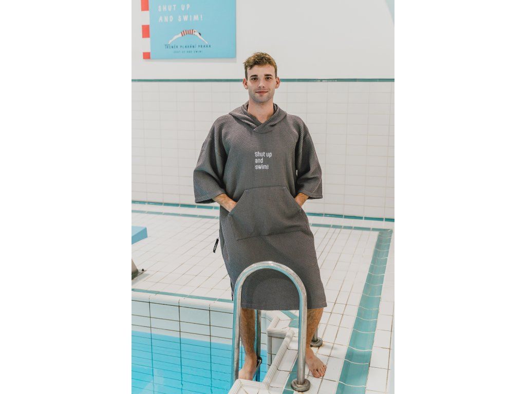 Vaflové šedé bavlněné pončo s bílou výšivkou Shut up and swim, ušito v České republice (zlaté české ručičky 🙌)